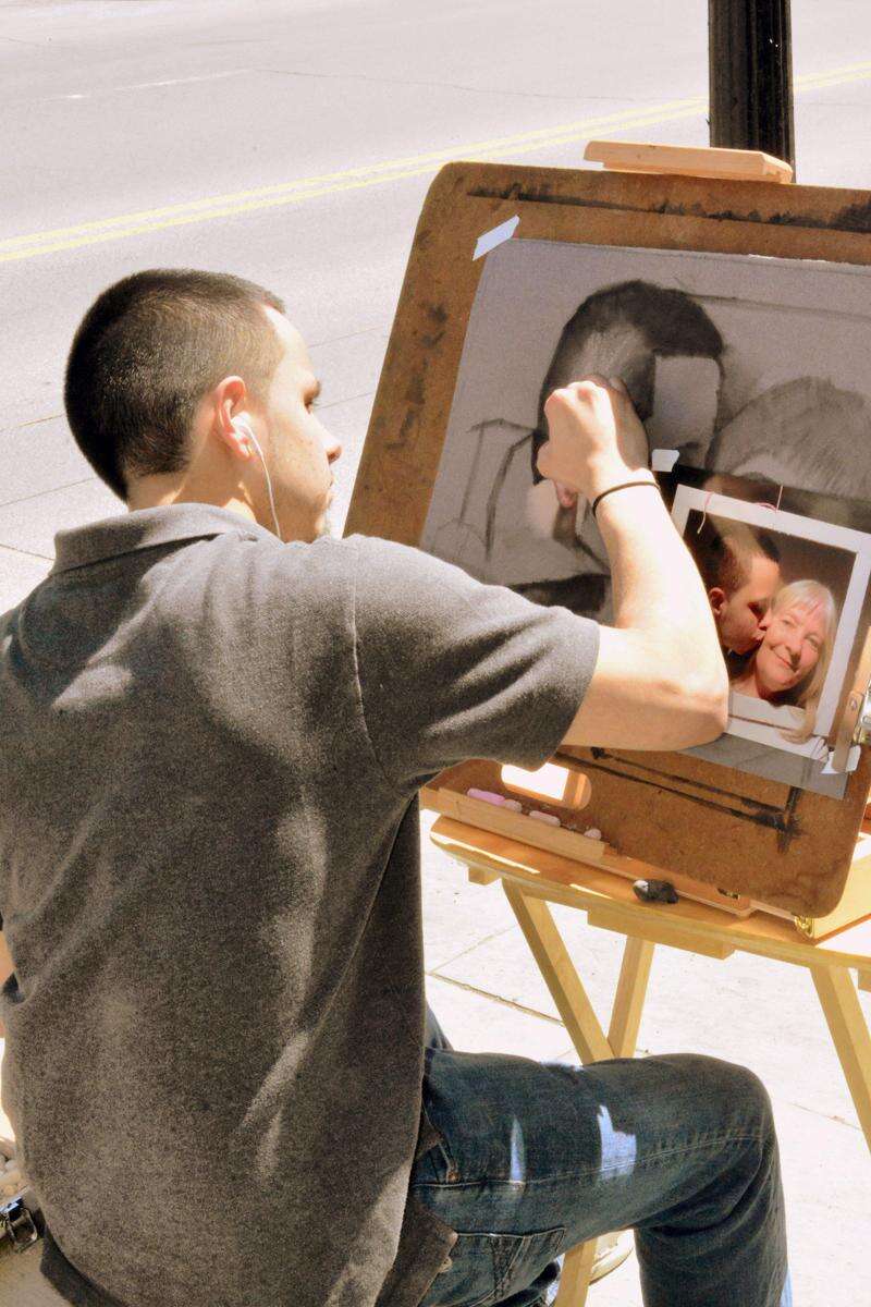 PRESS PHOTO BY DANA GRUBB Eric Kaczynski, a portrait artist from Allentown, takes advantage of warmer sunny weather April 12 to set up on Historic Main Street and work on a project. Kaczynski said he was visiting his mother, who lives in Bethlehem's center city, and couldn't miss the opportunity such a day provided. He uses charcoal mixed with pastels to give his work a 3D style.