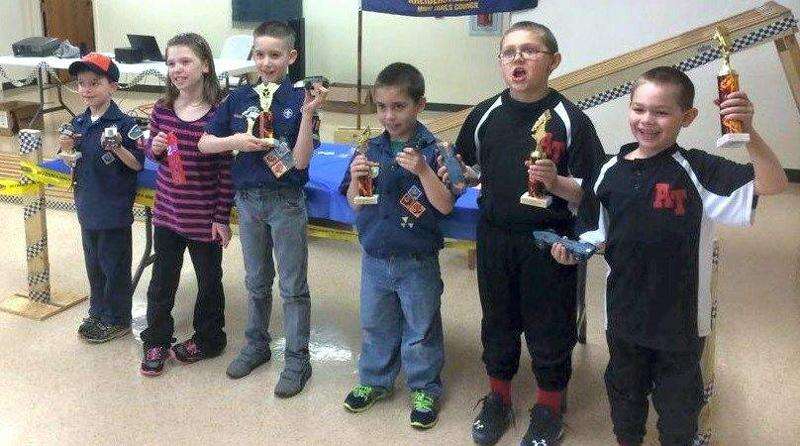 CONTRIBUTED PHOTO Pinewood derby racers show their prizes Saturday during Cub Scout Pack 40's first-ever event, held at Good Shepherd Lutheran Church, Kreidersville. Three racers, Jared Koch, Jacob Koch and Owen Dungan, will move on to the North Valley District race, set for April 25 at Springhouse Middle School, Allentown.