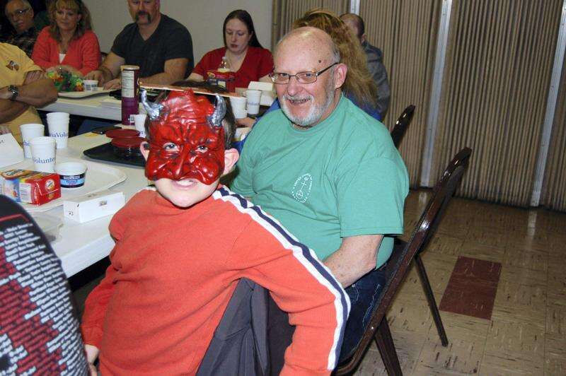 PRESS PHOTO BY JOIE JACKSON WENNER Who the devil is this? None other than Dakota Longenbach with his grandfather Grant Field. The two had a fun time at the recent penny party at Greenawalds UCC. Dakota won the devil's mask at the party.