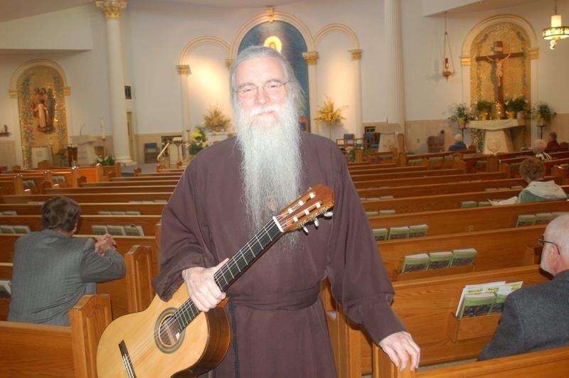 John Michael Talbot prepares for a rehearsal Saturday at Queenship of Mary Church, Northampton. His three concerts, held April 27-29 at the church, included a motivational address and music through song and acoustic guitar. Talbot is a renowned author and host of The Church Channel's 'All Things Are Possible.' PRESS PHOTO BY AL RECKER