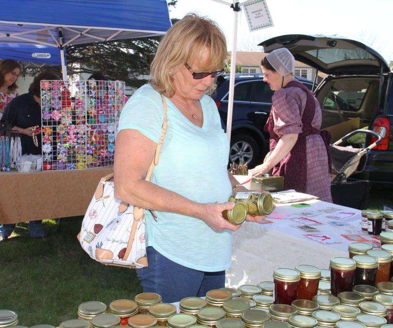 Louise Minnich of Whitehall chooses from an assortment of canned vegetables, jellies and butters made by Ellen's Garden during Faith Lutheran's spring craft fair, held Saturday at the MacArthur Road church.