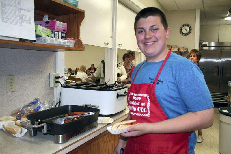 PRESS PHOTOS BY DEBRA PALMIERI Justin Solt of Heidelberg Township prepares hot dogs May 2 in the kitchen of Union United Church of Christ, Neffs, during the annual country sale.