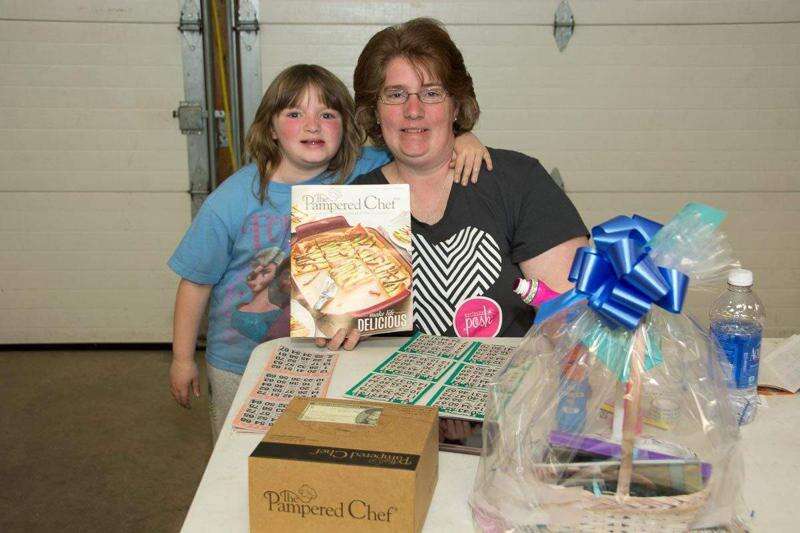 PRESS PHOTO BY LOU WHEELAND The Upper Lehigh Lions Club recently sponsored a vendor bingo in the Schnecksville Fire Company pavilion. Makayla Palutis helps her mom, Brandy, win Pampered Chef prizes.