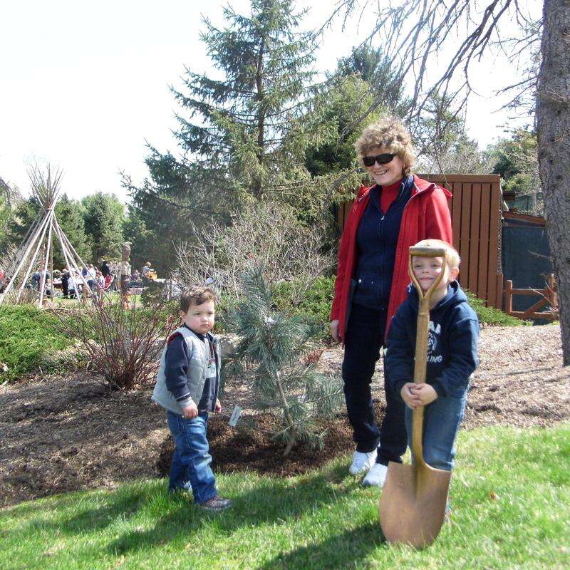 PRESS PHOTO BY JENNIFER BODISCH Jayden and Jordan Rehrig proudly help plant a limber pine April 25 at the Lehigh Valley Zoo, Schnecksville. The planting was in honor of their Mimi, Debra Barhight, conservation co-chair of the Parkland Garden Club. The boys' sister Elaina Ray helped, too. The event was to celebrate Arbor Day.