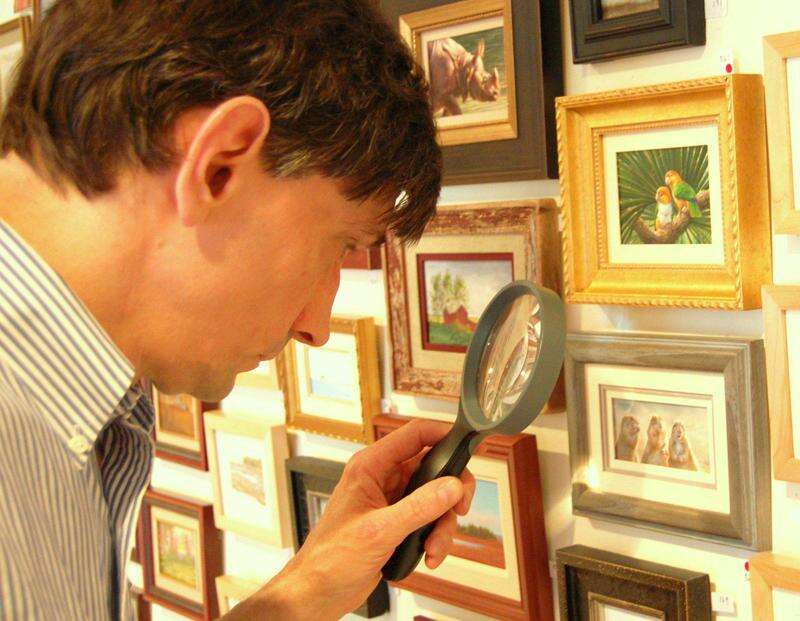 Press Photo by Tim Gilman Miniature art collector Joe Ciezko of Whitehall uses a magnifying glass to examine some of the 475 entries on display in the Art of the Miniature which opened May 3 and continues through June 14 at the Snow Goose Gallery in downtown Bethlehem at 470 Main St. Eighty-nine artists with their entries from the United States and some foreign countries make up the show in its 23rd year. Additional info at www.thesnowgoosegallery.com.