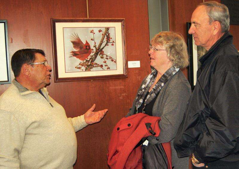 PRESS PHOTO BY TIM GILMAN Hillcrest Camera Club president Butch VanSeters discusses his special interest in wildlife photography and his photo of a cardinal in his backyard, entitled 'Take Off!' with club member Lynn Stecker and her husband Bob Stecker from Harmony, N.J. The month-long photography exhibit of 28 images was held in March at the Bethlehem Rotunda Gallery at the Bethlehem City Hall in Bethlehem. The round city art gallery is open the same hours as City Hall, Monday through Friday, 8 a.m. to 4
