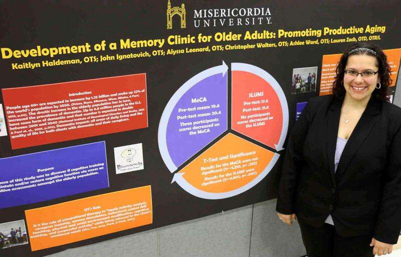 CONTRIBUTED PHOTO Misericordia University recently sponsored the annual Student Research Poster Presentation Day at the Anderson Sports and Health Center on campus. The presentations were the culmination of research and work on a variety of topics by more than 100 students in the Colleges of Health Sciences, Arts and Sciences, and Professional Studies and Social Sciences. Occupational therapy graduate student Alyssa Leonard of Bethlehem presented her research, 'Development of a Memory Clinic for Older