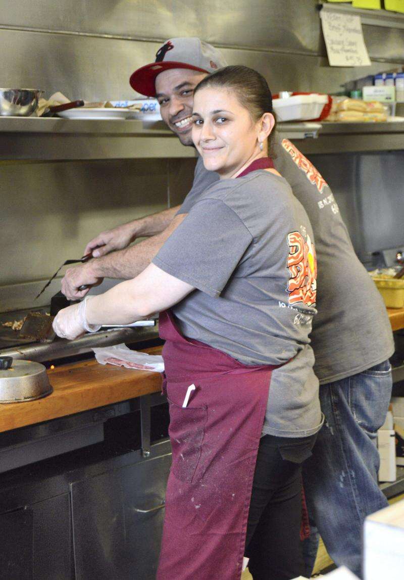 Right: Emily Alkhal and Ruben Santiago, owners of The Bacon Strip, prepare food for those attending the grand opening celebration.