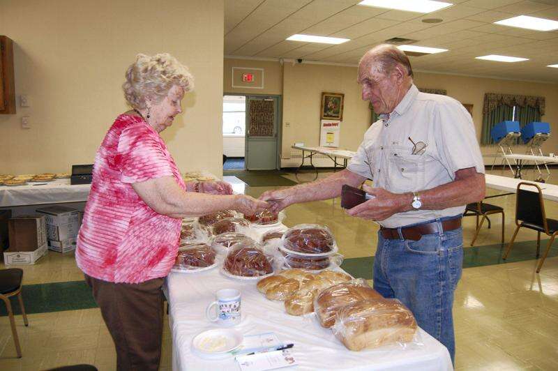 PRESS PHOTOS BY SUSAN BRYANT Ethel Harakal with the Northern Valley Ambulance Corps Ladies Auxiliary sells a cinnamon coffee ring to Stanley Kokolus of Coplay at the primary election day sale at the ambulance corps headquarters.
