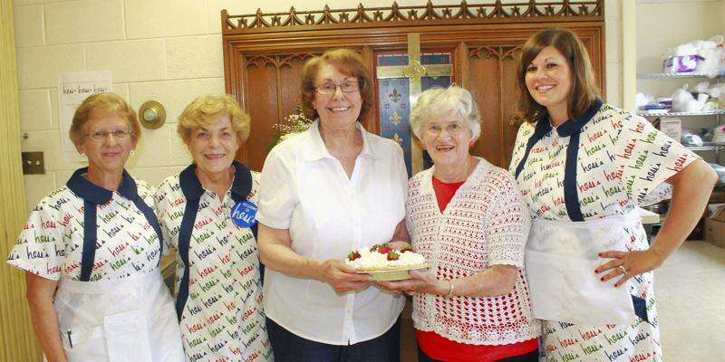 Peggy Tobias, Roseanne Yellers, Gina Creamer, Renae Yellers and Dorothy Clauser prepare to serve dinner at Good Shepherd Lutheran Church's Hess's Patio experience, held Saturday at the Kreidersville church. During the event, which sold out quickly, models walked among tables, church volunteers wore traditional uniforms and attendees enjoyed that famous strawberry pie.