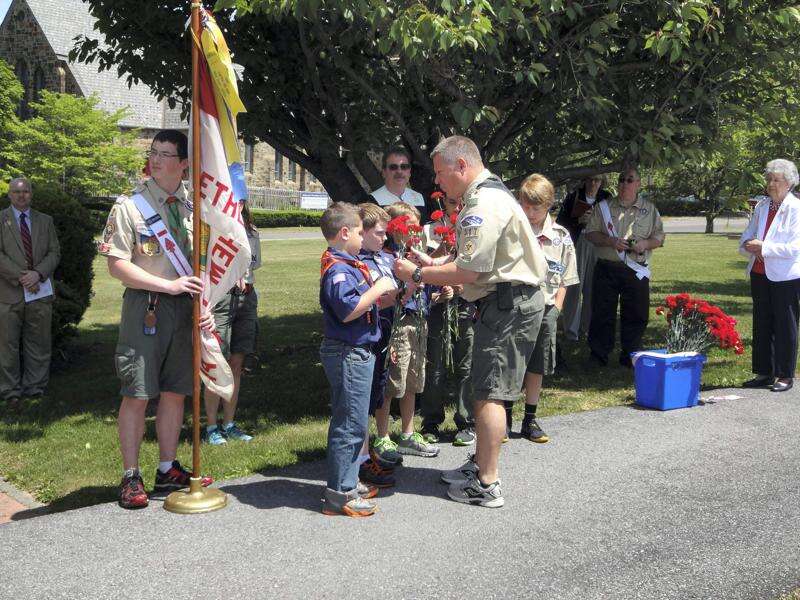 Press photos by Katya Hrichak Boy Scout Troop 317 joined the congregation of St. John's Lutheran Church of Bethlehem Township May 24 for a pre-Memorial Day event to remember the fallen. Following an indoor service, scouts of Troop 317 led the congregation across the street to the cemetery where a short ceremony was held, followed by the scouts placing a red carnation on every military grave as well as handing a flower to each military family. Once the flowers were distributed, the names of each fallen