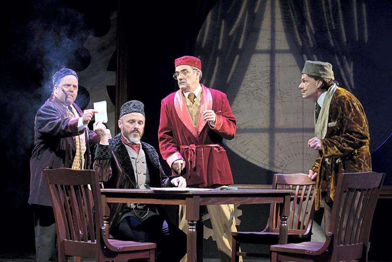 Director Russell Treyz, who directed PSF's first production of "80 Days" 10 years ago in 2005, lets the five actors, who play a total of 30 roles, loose on the neat set with its clock and watch-gear motif, designed by Bob Phillips and Samina Vieth, with scintillating lighting by Eric T. Haugen and sound effects by Stephanie Hodge. Red lights on a map backdrop track the characters' progress by, train, boat, automobile and elephant, but no hot-air balloon.