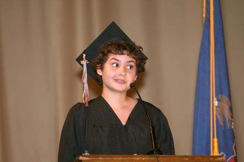 Student speaker Albert Nelthropp chose to discuss "the reality of our space" rather than the various talents and characters of members of the senior class, speaking about how what once was a factory has become a residence for the arts.