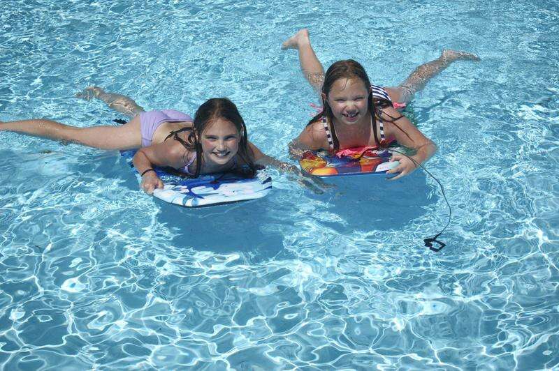 PRESS PHOTOS BY AL RECKER Left: Sisters Stevie and Sam Selverian, of Northampton, put their boogie boards to use on opening day at the Northampton Borough Municipal Pool June 6. Above: Lifeguards Emma Steirer and Dominic Sorrentino prepare for the first day. They are back for another summer of work at the pool.