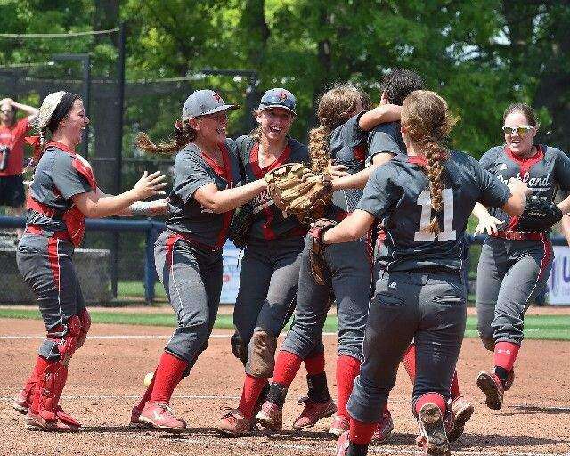 Parkland softball players celebrate in the pitching circle after the final out of last friday's PIAA Class AAAA Softball Championship game at Penn State University. PRESS PHOTO BY DON HERB