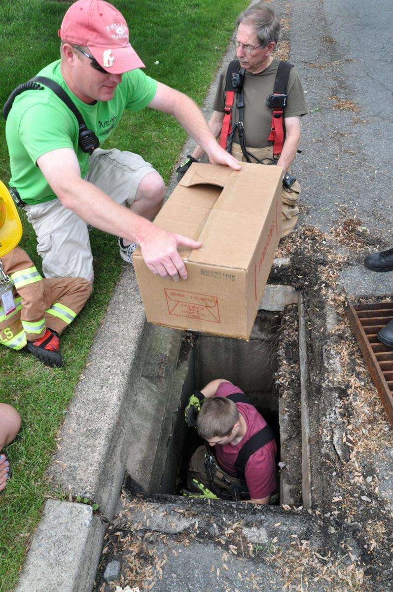 Firefighters from Western Salisbury Fire Department are called to an animal rescue along Regent Drive, near the Penn Treaty Insurance Company building near South Mall recently, after passers-by saw five ducklings fall through a storm sewer grate into the underground runoff system and called the Lehigh County 911 Center.