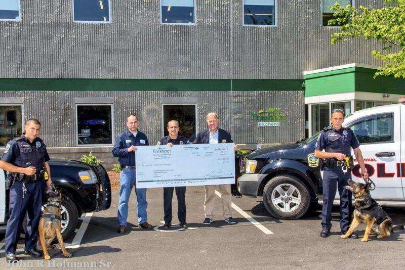 As the pleasant aroma of Freshpet kitchens wafted in the air, Thompson presented the check to Chief Roy D. Seiple. He was flanked on the left by Eyra, a Belgian Malinois whose partner is Officer Cody D. Hendershot; and on the right by Bo, a German Shepherd whose partner on patrol is SGT Darrin A. Wendling.