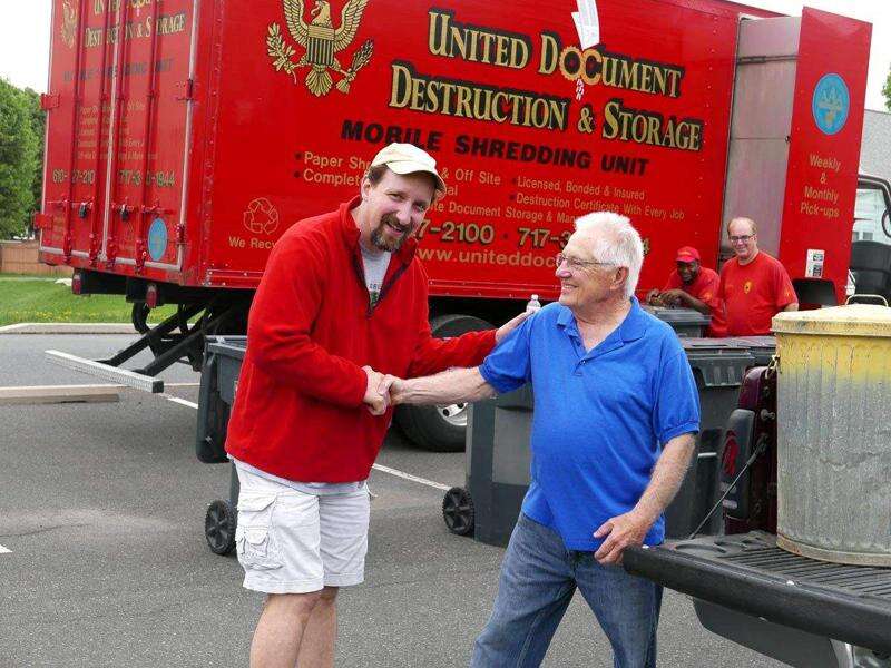 PRESS PHOTOS BY LOU WHEELAND Alan Billiard, manager/chief executive officer of Lehigh Valley Federal Credit Union, thanks Don Charles of South Whitehall, for bringing a garbage can full of documents to the shredding event.