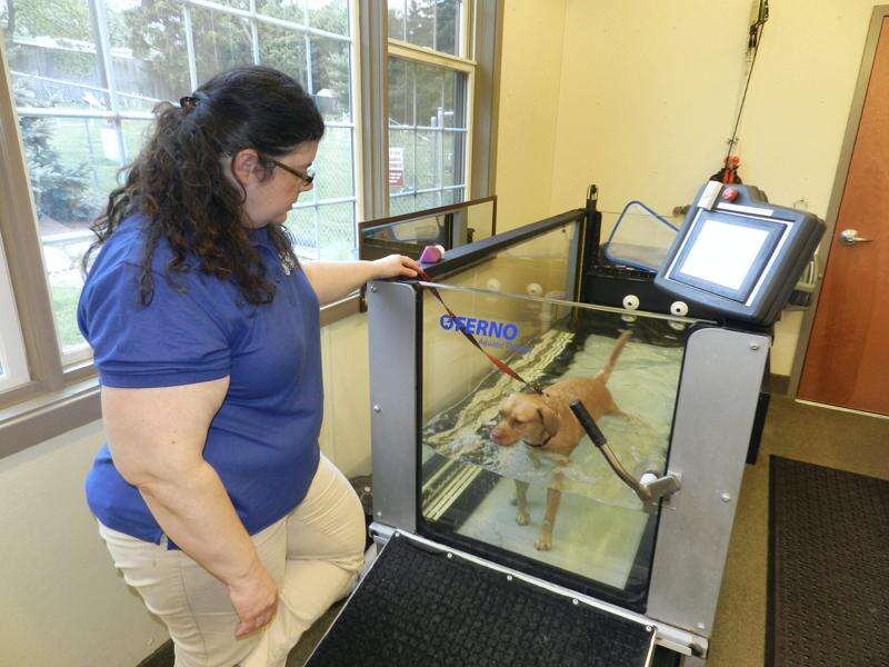 Dr. Kim Mayer, a veterinarian with the Animal Therapy Center, demonstrated agility training techniques with large inflatable rubber balls and wobble boards. With her dog Rylie, a shelter pet she adopted several years ago, Dr. Mayer showed how an enclosed treadmill partially filled with warm water was used to exercise and strengthen canine back legs while reducing pain.