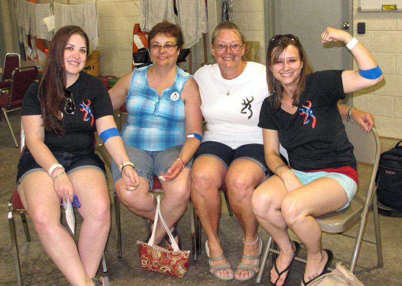Tara and Holly White, Deana Leibensberger and Karla Becker participate in a blood drive hosted by the Eastern Salisbury Fire Department recently. Participants received blue bands to mark their donation. The blood drive was held in memory of Wayne Leibensperger Jr. who died in a car accident on Route 22 in March 2014. Wayne Leibensperger Jr. was an avid blood donor who donated faithfully every eight weeks