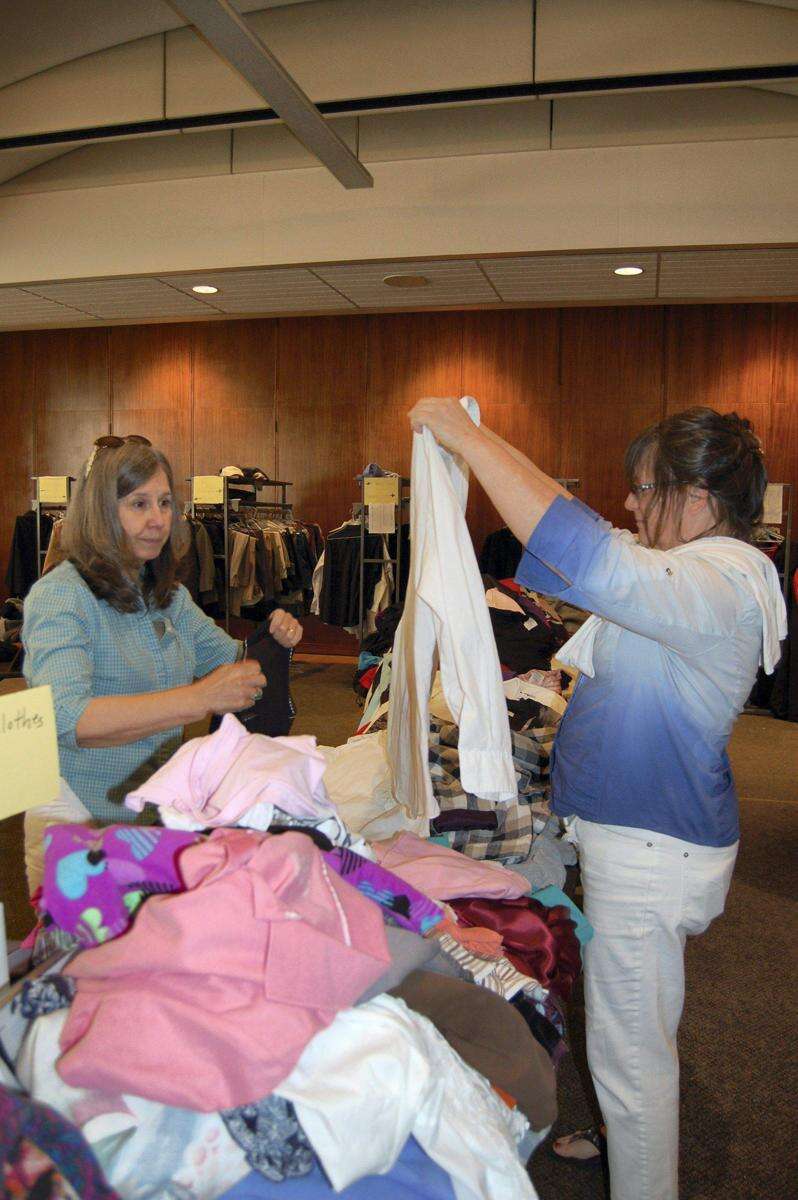 PRESS PHOTOS BY SUSAN BRYANT Lillian Corazza of Allentown and Susan Barone of Washington Township sort through women's clothing looking for the perfect blouse June 29 at the Keneseth Israel Sisterhood flea market at Congregation Keneseth Israel, Allentown.