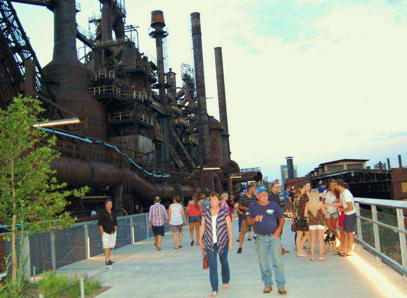 Press Photos by Tim Gilman The recently opened Hoover-Mason Trestle walkway alongside the iconic Bethlehem Steel blast furnaces attracts a crowd of visitors to the elevated city mini-park which is in the heart of SteelStacks and former Bethlehem Steel plant remnants in South Bethlehem. The third-mile elevated pedestrian city park provides a refreshing view of former Bethlehem Steel buildings and structures in various stages of redevelopment. The South Bethlehem walkway is accessible by three staircases and
