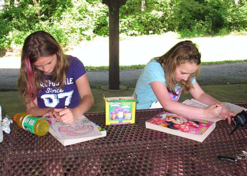 Emily Morris, left, and Saffi Reifinger enjoy a quiet moment coloring during the annual summer playground program in Salisbury Township.