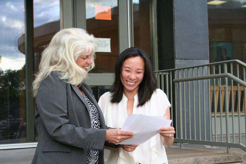 Bethlehem's Zoning Officer, Suzanne Borzak, reviews the Board's decision with Yujing Xie, Dr. Li's daughter.