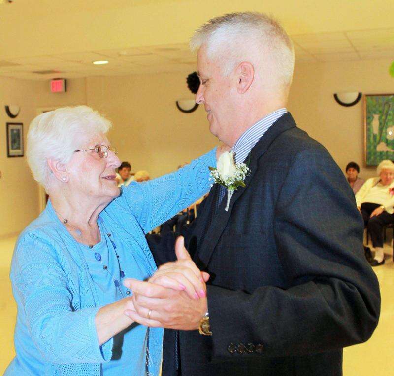 Both residents of Fellowship Community, Ethel Moyer and son Rick Moyer share a dance to the song, Crazy, by Patsy Cline, during the facility's senior prom June 26. The prom is created for residents to enjoy mingling with other residents while dancing or listening to the music of vocalist Maria Damore.