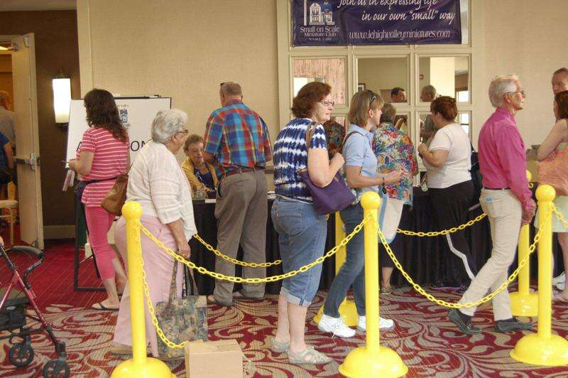 Fans of miniatures lineup early for the 38th annual dollhouse and miniatures show and sale hosted by the Lehigh Valley Small on Scale Miniatures Club at the Holiday Inn, Fogelsville, July 12. The event featured numerous vendors displaying everything from tiny trees to miniature pets to teensy tomatoes. PRESS PHOTOS BY APRIL PETERSON