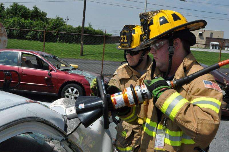 Western Salisbury Fire Department firefighters Nicholas Fisher, left, and Benjamin Metzger, use a hydraulic "jaws-of-life" type power tool to cut through a pillar of a junked vehicle recently at a training exercise at the Allentown Fire Academy at the Mack South fire station along Lehigh Street. The exercise, under the supervision of a state-certified vehicle rescue trainer, was part of a classroom and practical training course Western Salisbury Fire Department provided for its firefighters.