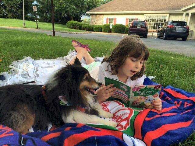 PRESS PHOTO COURTESY KAREN CSENCSITS Ellie Kolasa,7, of Upper Macungie, a second grade student at The Swain School, reads to Casey, a sheltie and member of Lehigh Valley Therapy Dogs June 15 at the Read to the Pups at Parkland Community Library. Casey, 9, is owned by Karen Csencsits of Schnecksville.