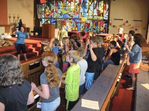 PRESS PHOTOS BY LORETTA FENSTERMACHER The 'Yetis' group, led by Amanda Trittenbach and Celeste Daley, learn four songs everyone will be singing in church this year. Their 'Sherpa' is Terri Kernechel. Each of the five groups of children at VBS had a Sherpa helping them climb the mountain. A Sherpa is a lifetime native of Mount Everest who helps people climb the mountain as their lungs are adapted to the mountainous altitude.