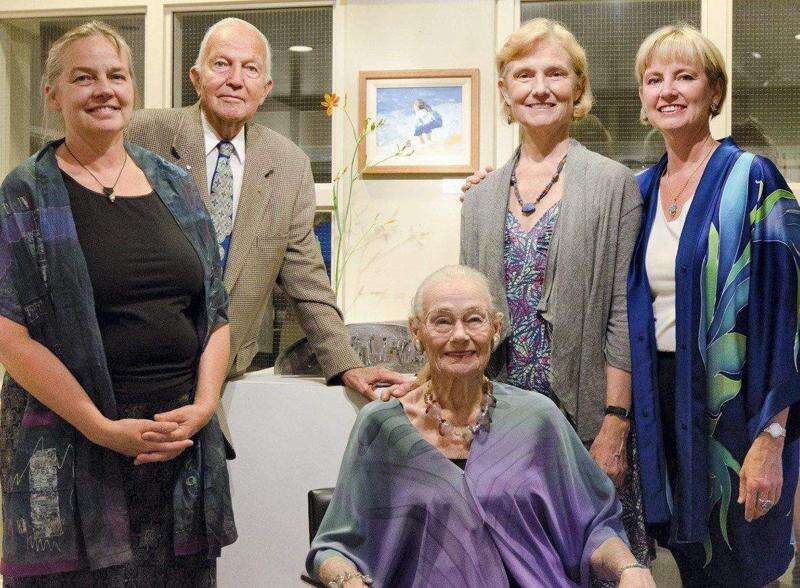 The exhibition, "Mary Lou Cummings & Daughters," concluded Aug. 4 in the David E. Rodale Gallery and Rodale Family Gallery at the Baum School of Art, Allentown. Mary Lou Cummings was a Baum School trustee for three decades. From left at the July 16 opening reception, are: Pamela Cummings; Don Cummings, Mary Lou Cummings's husband; Mary Lou Cummings (seated); Rebecca Wynsome, and Linda Cummings. In addition to paintings by Mary Lou Cummings, the exhibition included work by Pamela Cummings, a ceramist; Rebecca Wynsome, a painter, and Linda Cummings, a photographer.