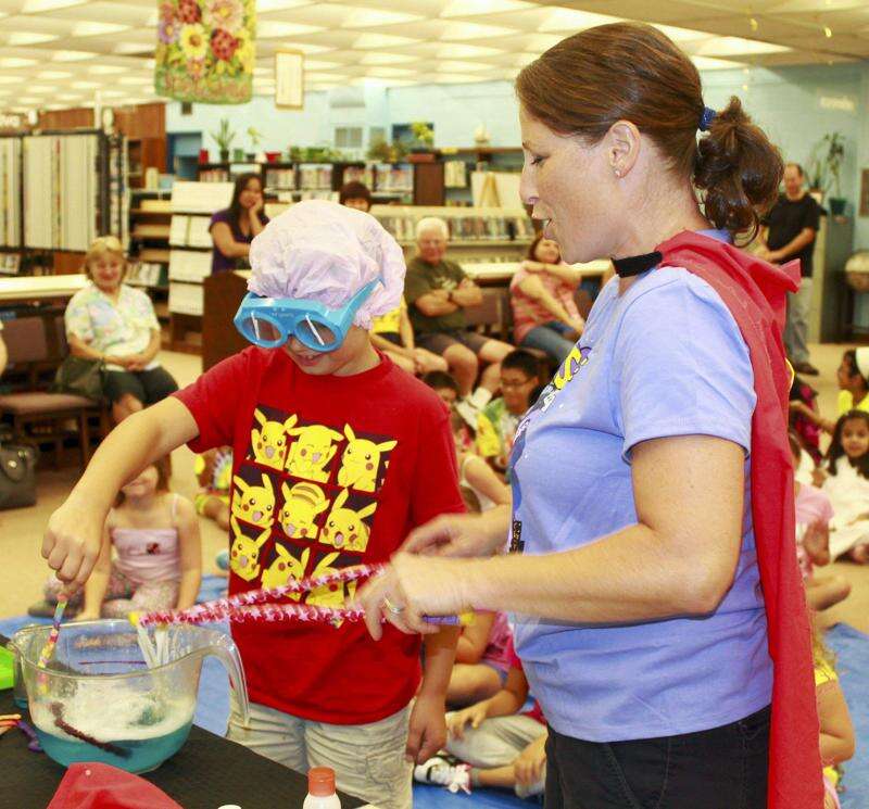Cody Kurczeski of Catasauqua helps Ms. Cathy during a Super Science Amazing Art presentation last month at the Whitehall Township Public Library. Cody, along with the other children present, learned how to make different shapes and sizes of bubbles using soap and water.