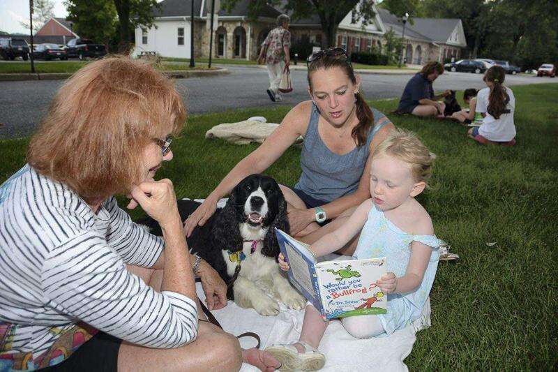 PRESS PHOTOS BY LOU WHEELAND Parkland Community Library recently offered Read to the Pups, an event used to encourage younger readers to improve their skills as well as relate to Therapy Dogs by reading to them. Kathy Dimmick and her English springer spaniel, Maggie, 6, listen as Tara Grather helps 3-year-old Daisy read to them.