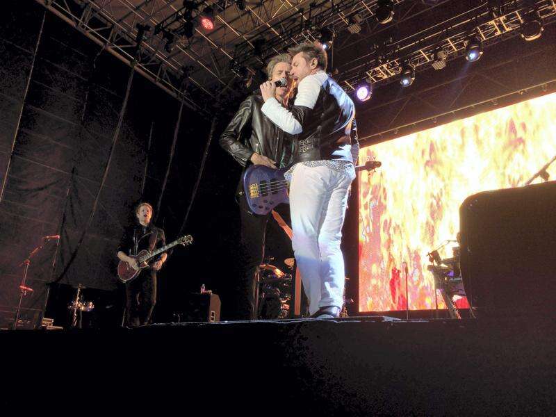 PRESS PHOTO BY KAREN SAMULES Duran Duran members Dom Brown, John Taylor and Simon Le Bon play their 1984 hit 'The Wild Boys' on the Musikfest Sands Steel Stage during preview night Aug. 6. When Duran Duran requested to play a day earlier than Musikfest was scheduled to open, ArtsQuest officials happily accommodated the British pop band making it the first main stage preview night in Musikfest's 31-year history. The 4,000 plus attendees were lucky with the beautiful summer night weather and a great show by