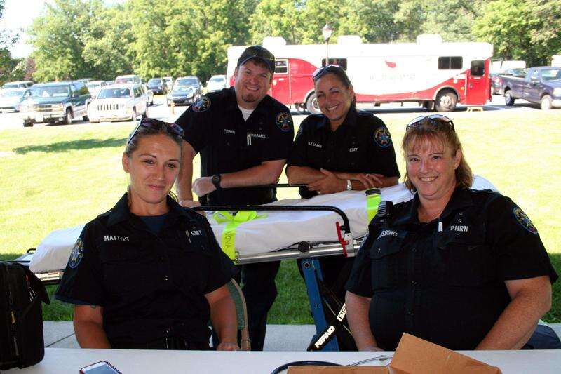 PRESS PHOTO BY DEBRA PALMIERI Northern Valley Ambulance Corps Paramedic Ben Perry, EMTs Diane Williams and (front) Vanessa Mattos, along with pre-hospital RN Michelle Bisbing provided information and pamphlets to visitors attending the recent Upper Lehigh Lions Club Crafts in the Grove at Neffs UCC.