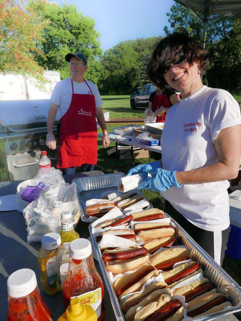 South Whitehall Township recently celebrated National Night Out at Covered Bridge Park. The event was sponsored by local Crime Watch organizations. Morris Halpin and Heather Dubov, Crime Watch volunteers, serve up food to attendees during Night Out. PRESS PHOTOS BY LOU WHEELAND