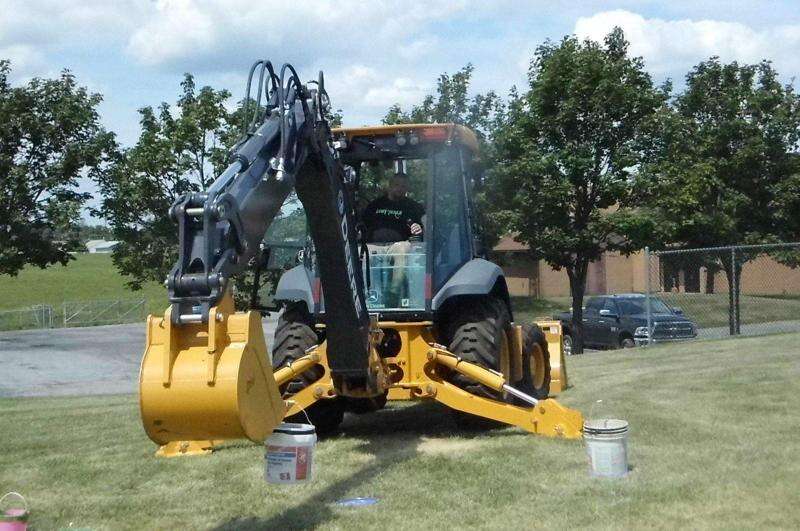 PRESS PHOTO BY JENNIFER BODISCH Brian Rex of North Whitehall Township carefully lifts a bucket and places it carefully down on the bucket lid. He won second place in the Lehigh County Association of Township Officials Summer Convention Equipment Rodeo Aug. 7 at the Schnecksville Fire Company.