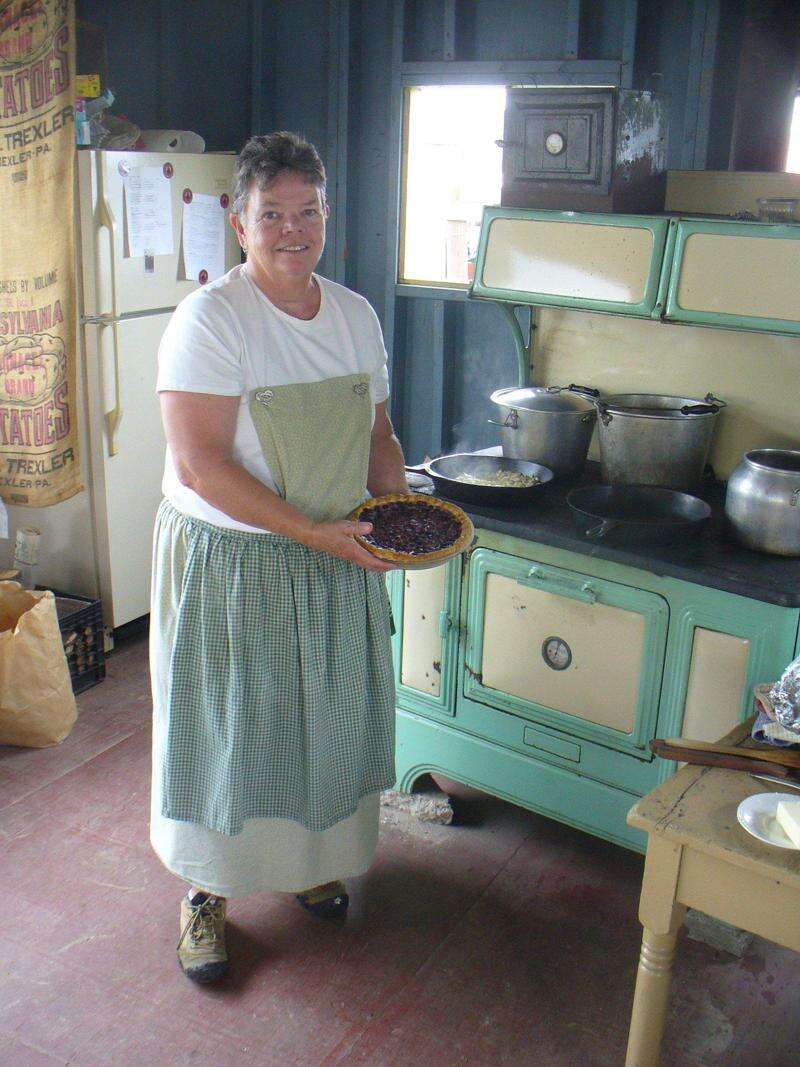 PRESS PHOTO BY JERRY WOJCIECHOWSKI Albany Township Historical Society President Lucy Muth displays a blueberry pie baked earlier in the summer kitchen's wood stove at the recent Kutztown Folk Festival.