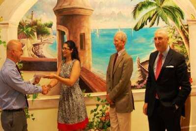 Press Photo by Tim GilmanThe Hispanic Center in South Bethlehem received financial assistance recently from the R.K. Laros Foundation for renovations to the Basilio Huertas Senior Center. George Mowrer, a trustee from the Lehigh Valley benevolent foundation, presents a check to Lorna Velasquez, executive director of the Lehigh Valley Hispanic Center at 520 East Fourth St. WIth them are Paul