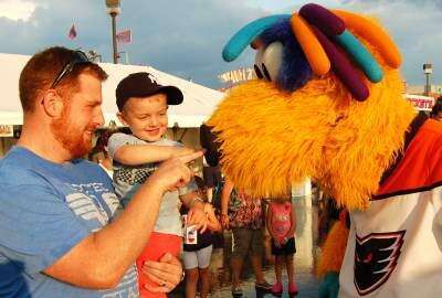 Press Photos By Tim GilmanPladoodle, the colorful mascot of the new L.V. Phantoms ice hockey team, attracts Jerry Gunsten of Easton and his nephew Jacob Casella of Pen Argyl on the grounds of the festival. βIt's a family event; we come every year,β said Gunsten. The L.V. Phantoms skate their first game Oct. 10 with a home opener at the recently opened PPL Center Arena.