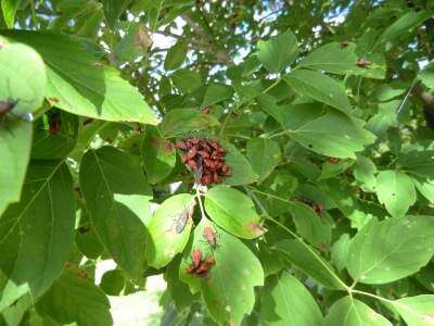In spring as the weather starts to warm up and as boxelder buds are opening, adults emerge from their overwintering sites and fly to the boxelder trees. After mating, the female lays her small, red eggs in the bark’s cracks and crevices, and also on young leaves. In 10 - 14 days, the eggs hatch into bright red nymphs that feed on leaves and seeds. They insert their piercing-sucking mouth parts into the tissue and continue to feed until they reach adulthood. After reaching adulthood, they continue to feed on the leaves and seed until the weather starts to cool when the bugs start looking for a home to overwinter.
