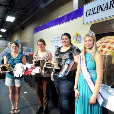 PRESS PHOTO BY JENNIFER BODISCHJudges taste and score the 14 entries at the PA Preferred Chocolate Cake Contest. And the winner of the 2015 Allentown Fair's PA Preferred Chocolate Cake Contest is Amy Gress of Danielsville. She holds her blue ribbon, cook book prize, and “chocolate cake with piped peanut butter frosting.” Standing next to her is 2015 Allentown Fair Queen, Aliza Nyce, who presented