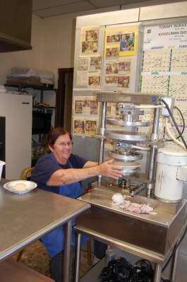 Above: Suzanne Pferffer of Slatington is all smiles as she operates the pie crust press for the shoofly pie sale Sept. 14 at Northern Valley Ambulance headquarters in Ormrod. Left: Northern Valley Ambulance Ladies Auxiliary members Lucille Blose, Judy Seyler and Irene Shoemaker pinch the sides of the crust for the shoofly pies before they are filled. Fellow members Carol Kotch places dough in pie