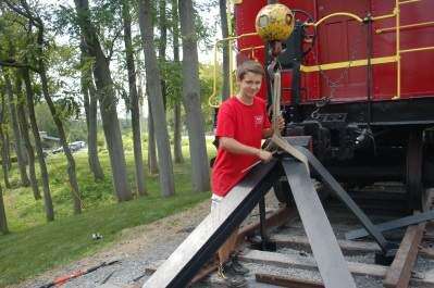 PRESS PHOTO BY AL RECKERBlake Sidleck, 16, of Boy Scout Troop 57, Neffs, has completed more than 100 hours toward his Eagle Scout project, installing a two-ton railroad stop on the caboose at the Ironton Rail Trail in Stiles. The project included rail tracks, dozens of bolts, shop work and the use of a crane. The railroad stop needed some TLC before it could be installed. Blake removed the rust,