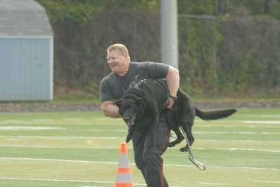 Whitehall Police Department canine officer Richard Garner gives his partner Onyx a lift during the obstacle course competition at the Sept. 27 K-9 Trials at Salisbury High School.PRESS PHOTO BY JIM MARSH