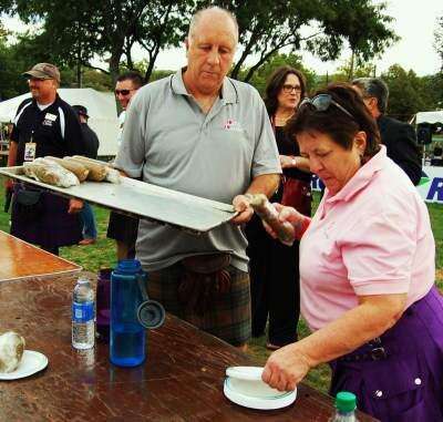 PRESS PHOTO BY TIM GILMANBethlehem residents Neville Gardner and his wife Linda distribute the fat sausage look-alike patty of sheep's stomach, heart, liver and lungs to the tables used for the haggis-eating competition. The contestants are timed and the first one to digest the one-pound haggis sausage is the winner. This year's contest attracted 16 entrants, some of whom wore kilts and
