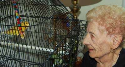 PRESS PHOTOS BY TIM GILMANCentenarian Margie Firuta talks with her favorite pet canary “Pedi” in her bedroom. Her daughter Linda Borchert, who Margaret lives with, says the miniature canary is her favorite indoor pastime. She also loves to feed the birds and small animals in their yard and waters the flowers daily, added her daughter. Margaret Cerne moved from Stirling, N.J., a year ago to live